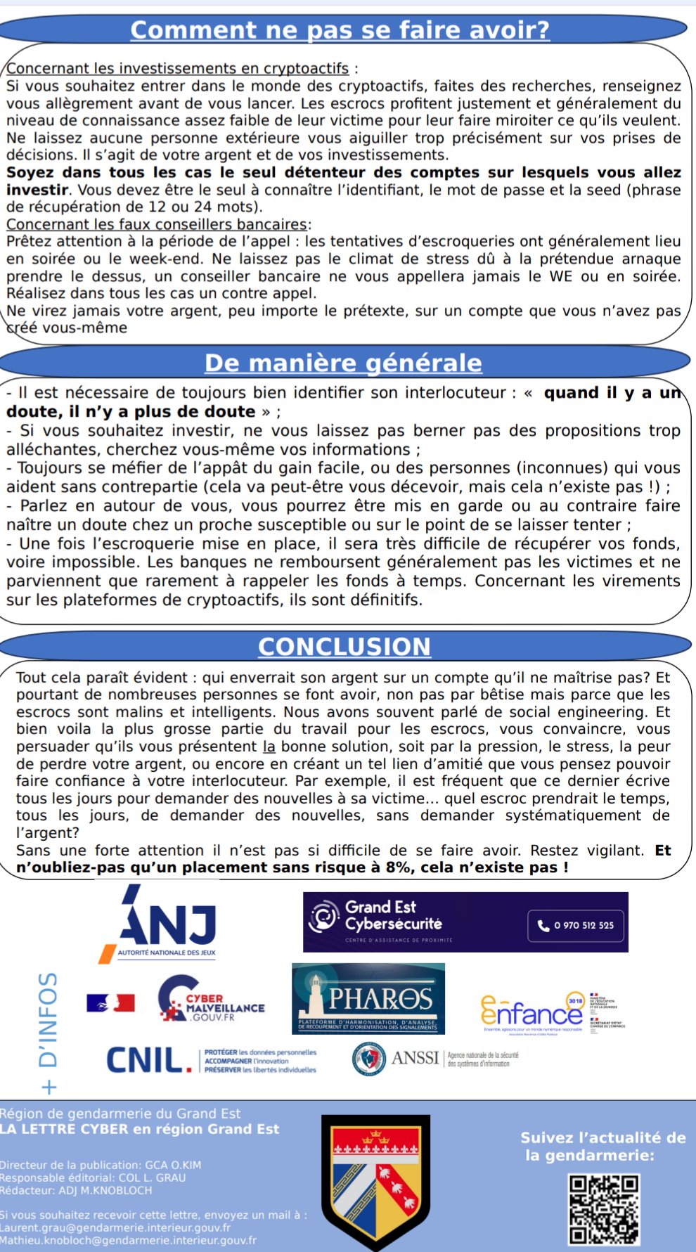 La gendarmerie vous informe pour vous protéger des escroqueries aux faux conseillers bancaires ou faux traders de cryptoactifs.