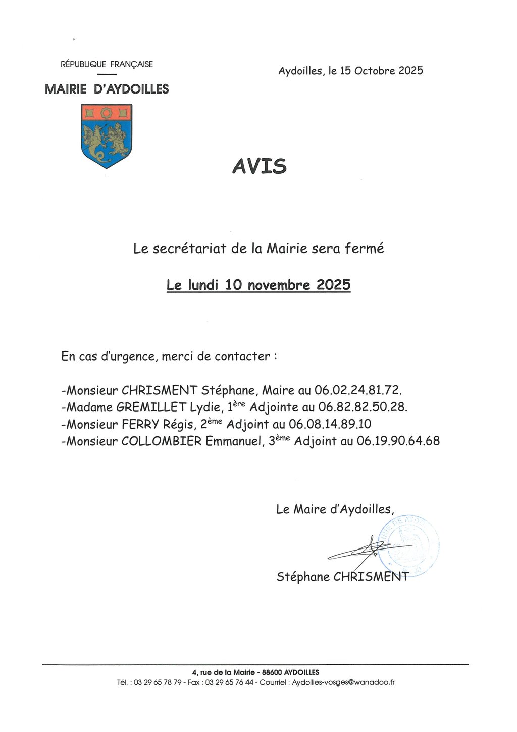 Le secrétariat de la mairie sera fermé le lundi 10 novembre 2025.