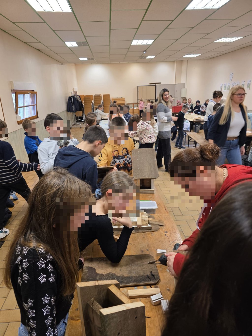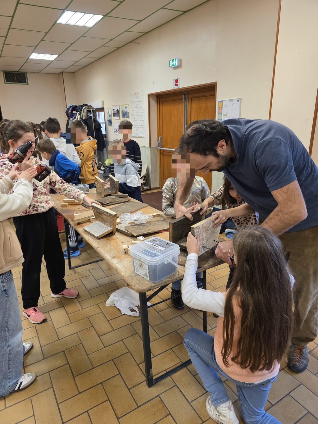 Dans la salle polyvalente mise à disposition par la commune d’Aydoilles, avec la participation des institutrices, cette activité a débuté par la réalisation de nichoirs en bois, en terre et de mangeoires en bois. Ces petites constructions d’une taille accessible aux enfants ont permis de faire le lien avec les constructions et matériaux qui nous entourent. Associé à la terre crue ou à d’autres matériaux, le bois a toujours joué un rôle important dans les bâtiments qui accompagnent les humains depuis des centaines d’années.