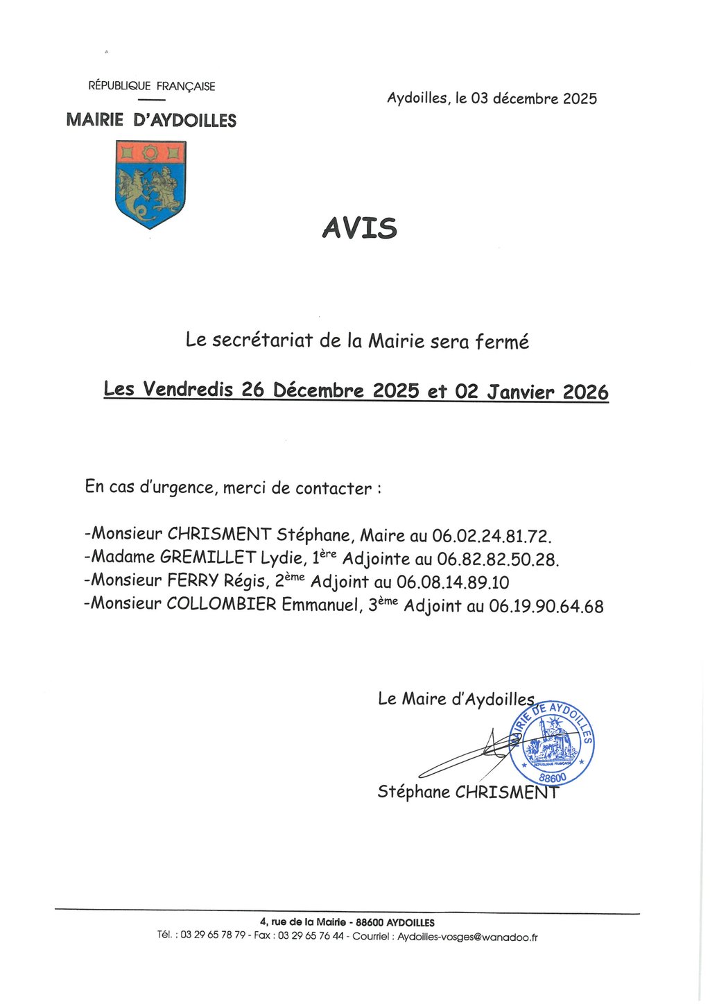 Le secrétariat de la Mairie sera fermé Les Vendredis 26 Décembre 2025 et 02 Janvier 2026.