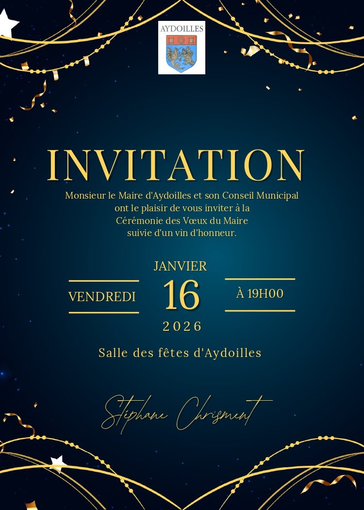 Monsieur Le Maire d'Aydoilles et son Conseil Municipal ont le plaisir de vous inviter à la Cérémonie des Vœux suivie d'un vin d'honneur le Vendredi 16 janvier 2026 à 19h00 à la Salle des fêtes d'Aydoilles.