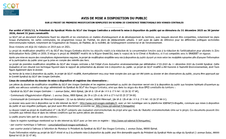 AVIS DE MISE À DISPOSITION DU PUBLIC DU PROJET DE PREMIÈRE MODIFICATION DU SCOT